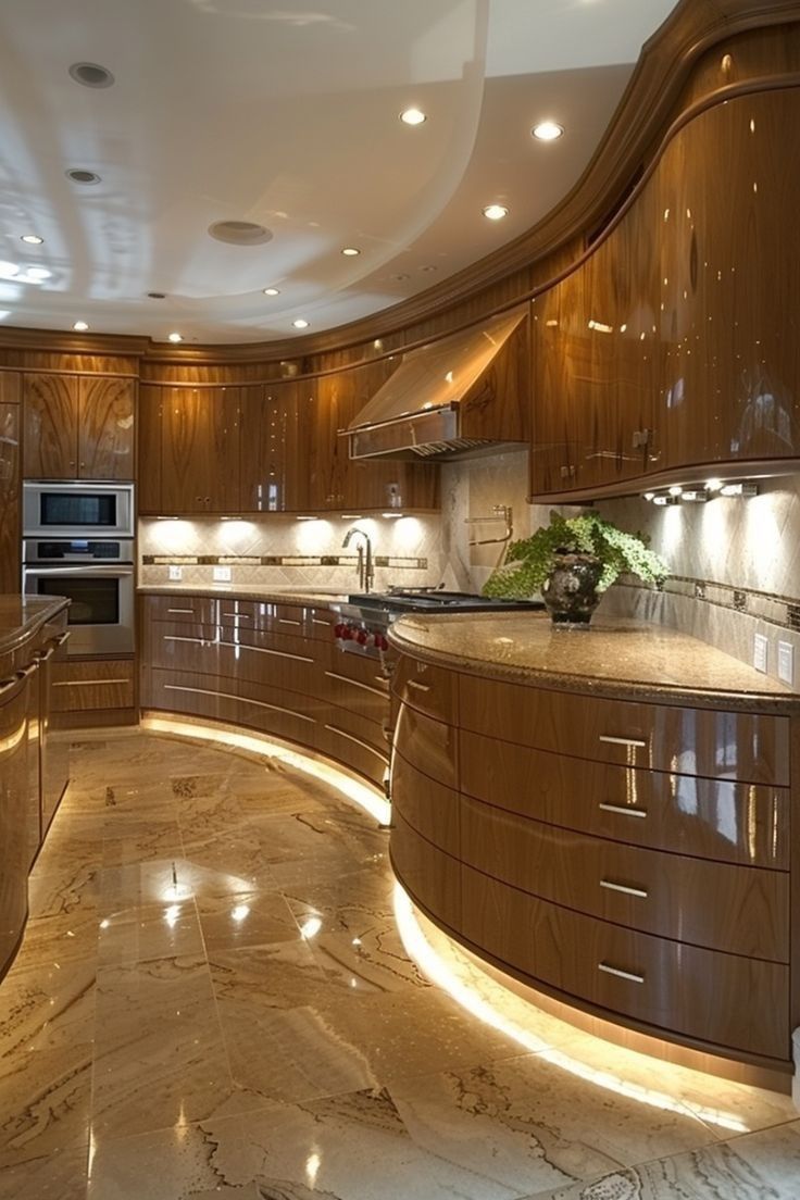 ایجاد عمق در سقف، یکی از ویژگیهای معماری کلاسیک است. اجرای کناف چندلایه با فرمهای منحنی، دایرهای یا بیضی میتواند این حس را تقویت کند. چنین سقفی اغلب در ترکیب با لوسترهای کلاسیک و نورپردازی مرکزی استفاده میشود. این طرح بیشتر برای آشپزخانههایی با ارتفاع سقف زیاد یا پلان باز توصیه میشود.