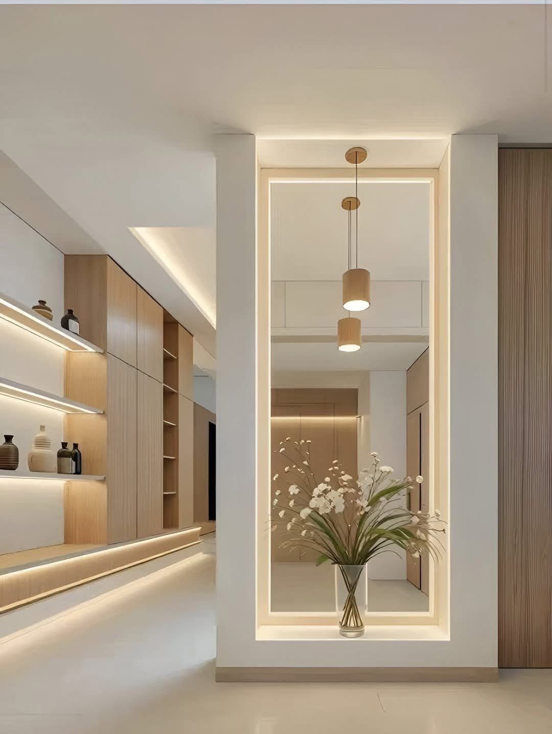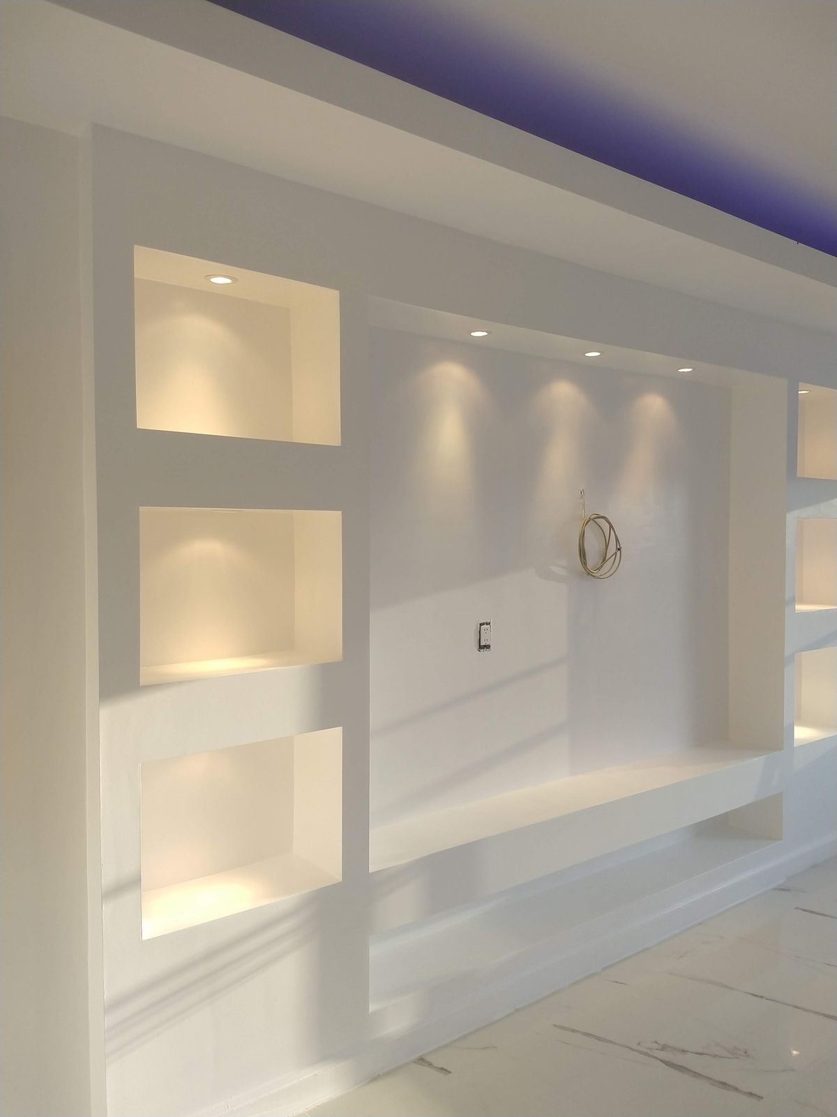 ۶. کناف روی دیوار پذیرایی با قفسههای توکار