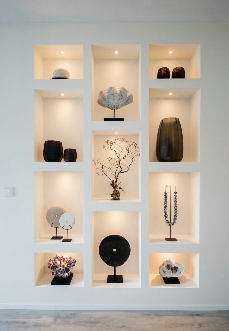 اگر فضای پذیرایی کوچک است، طراحی قفسه و طاقچه با کناف روی دیوار کمک میکند بدون اشغال فضا، دکور و نظم بیشتری داشته باشید. درون این فضاها میتوان کتاب، گلدان یا وسایل تزئینی قرار داد.