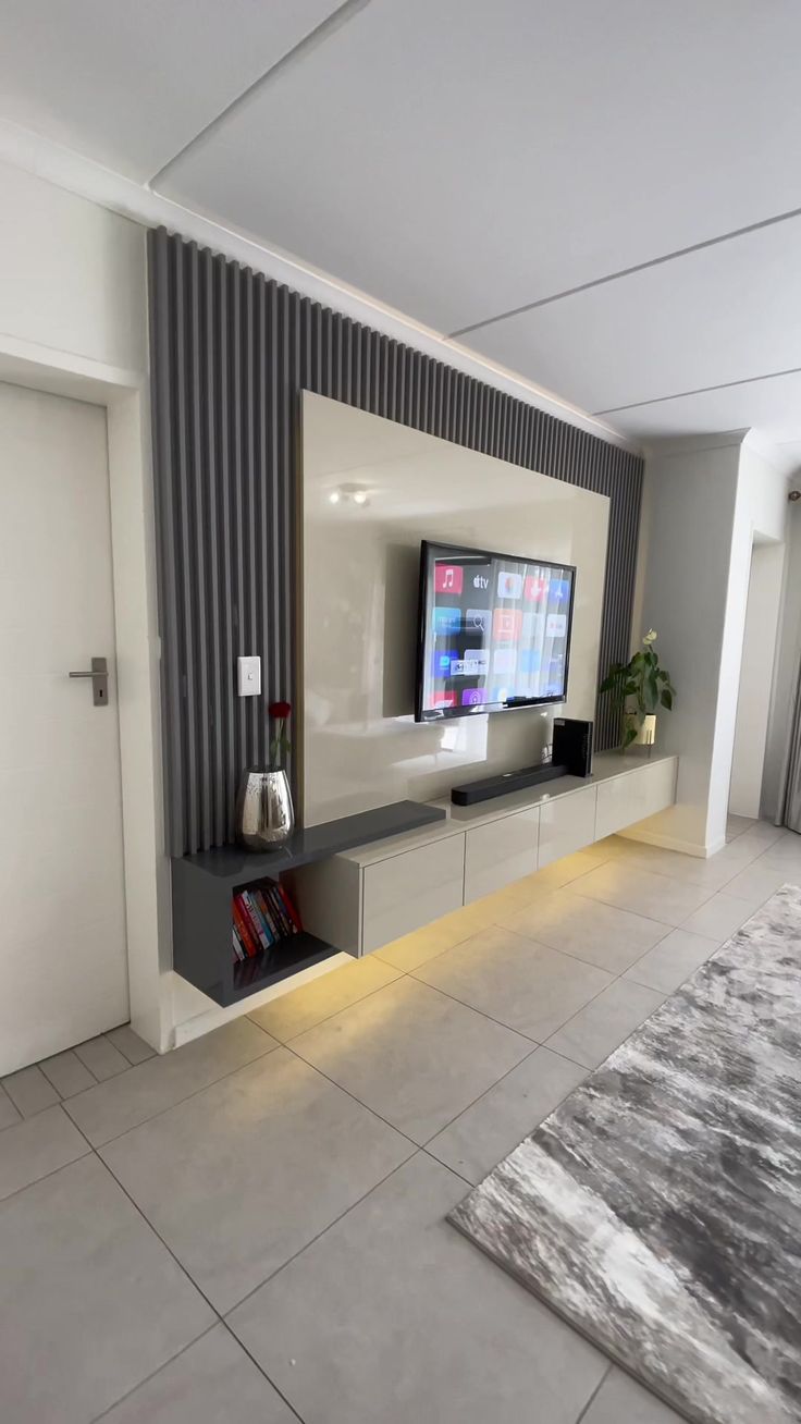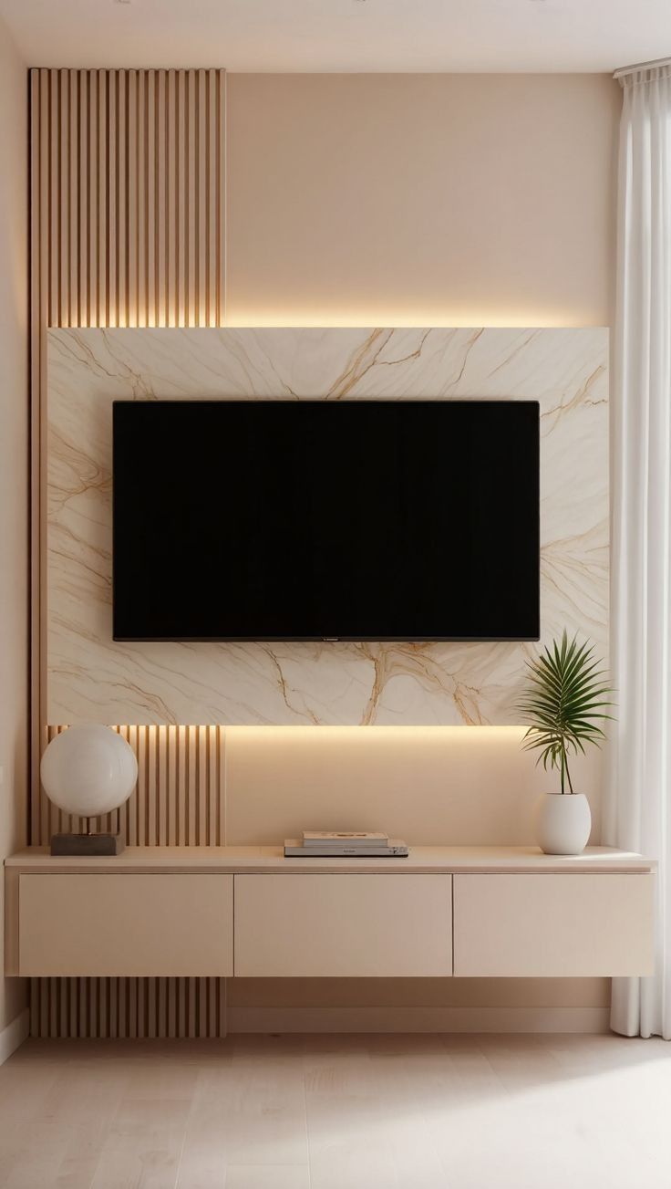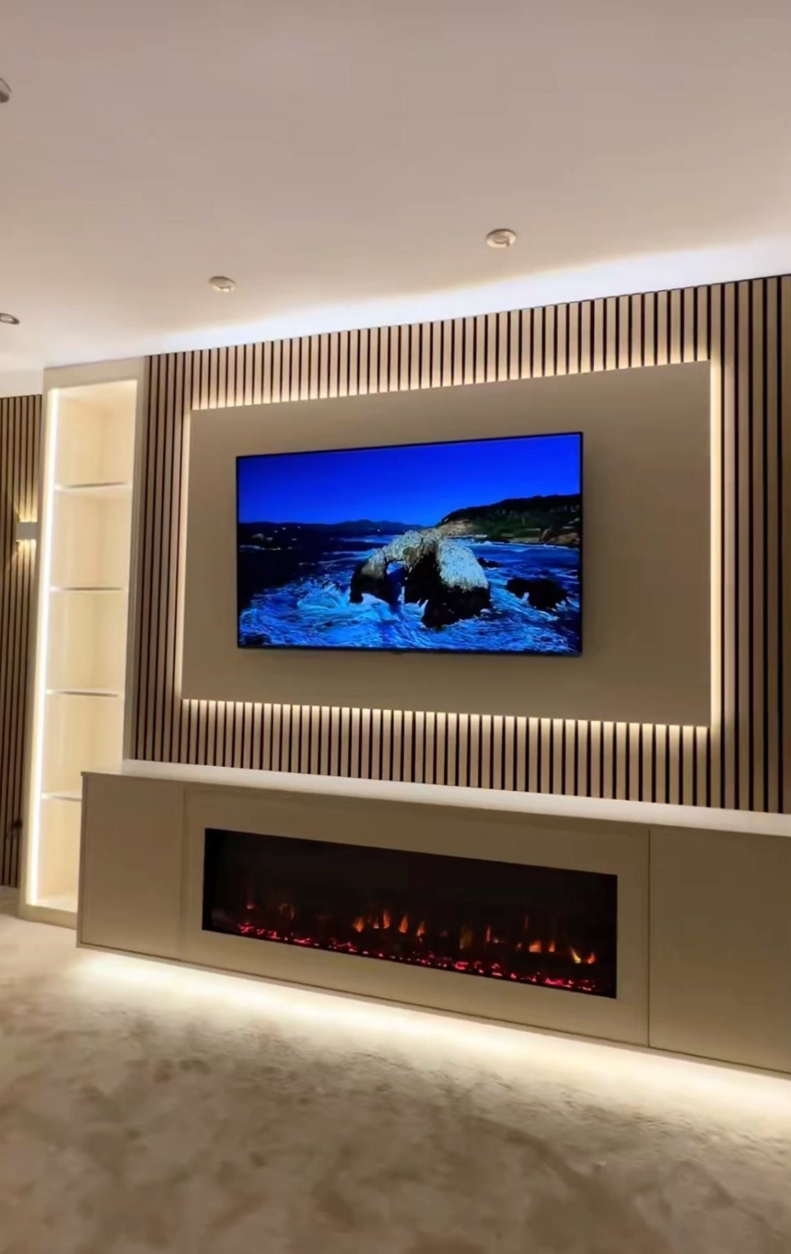 ترکیب قاب مربعی تلویزیون با دو قفسه عمودی در دو طرف، علاوه بر زیبایی، کاربری بیشتری ایجاد میکند. شما میتوانید در این قفسهها از المانهای دکوری، گلدان یا کتاب استفاده کرده و با نور مخفی داخل قفسه، جلوهی دکور را دوچندان نمایید.