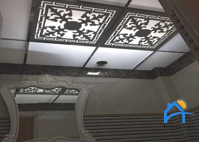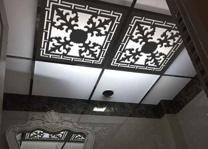 سقف کاذب سرویس بهداشتی طرح دار با کمک تایل سقفی سرویس بهداشتی، تایل سقف حمام، تایل سقف دستشویی، تایل سرویس بهداشتی و طرح‌های CNC مثل سقف CNC سرویس بهداشتی و سقف سی ان سی سرویس بهداشتی، زیبایی منحصر به فردی به محیط اضافه می‌کند.