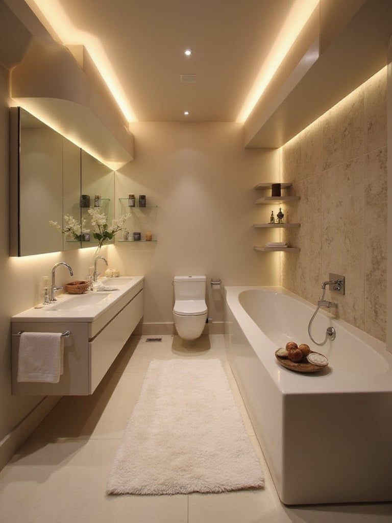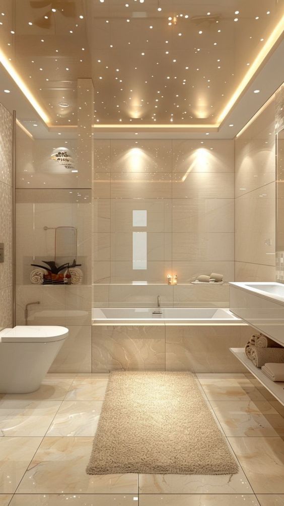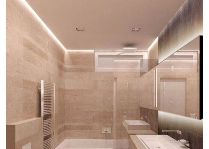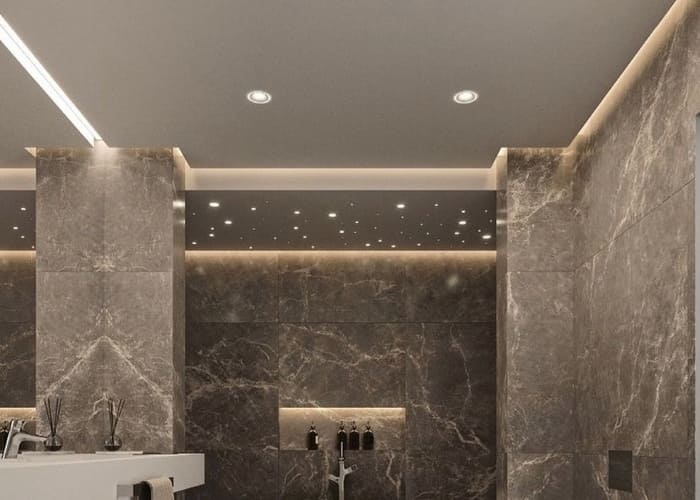 یکی از جذابیت‌های جدیدترین سقف حمام و دستشویی کناف، قابلیت اضافه کردن نور مخفی یا خطی برای فضایی لوکس است.