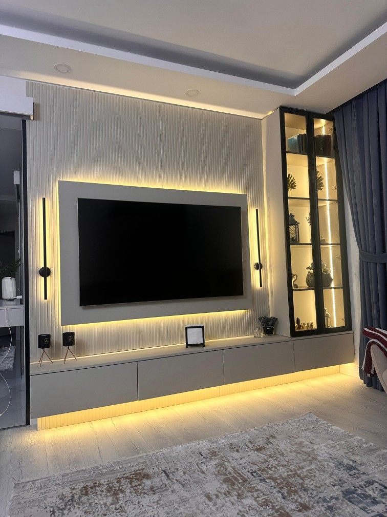 ترکیب قاب مربعی تلویزیون با دو قفسه عمودی در دو طرف، علاوه بر زیبایی، کاربری بیشتری ایجاد میکند. شما میتوانید در این قفسهها از المانهای دکوری، گلدان یا کتاب استفاده کرده و با نور مخفی داخل قفسه، جلوهی دکور را دوچندان نمایید.