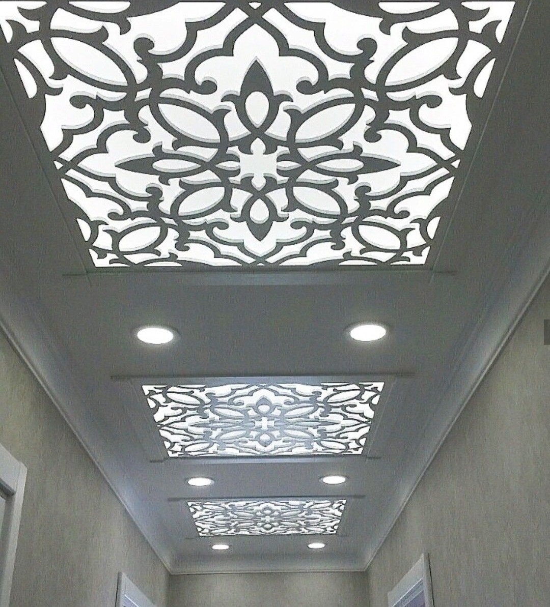 در این مدل، پشت تایل معرق PVC یک طلق چاپشده با تصویر آسمان، گل یا طرحهای انتزاعی نصب میشود. این ترکیب جلوهای سهبعدی و خاص به سقف میبخشد و تداعیگر حس باز بودن فضا است. بسیار مورد استقبال پروژههای تجاری و مسکونی مدرن قرار دارد.